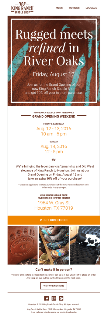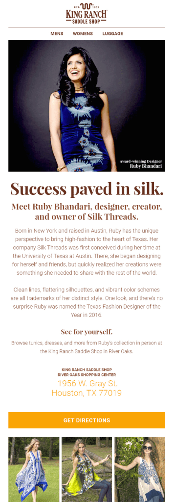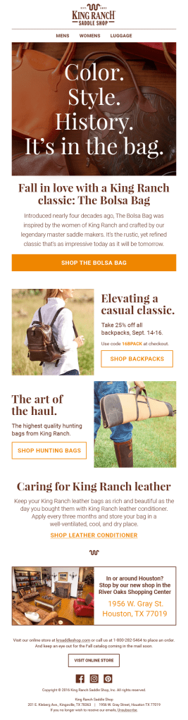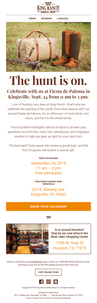 King Ranch isn’t just a charming brand name. It’s a real ranch in Kingsville, Texas that occupies an area larger than the state of Rhode Island. But even with such a sizable geographic footprint—their digital reach needed some help. Along with collaborating with the creative team and our clients, I wrote monthly emails to highlight sales and promotions.