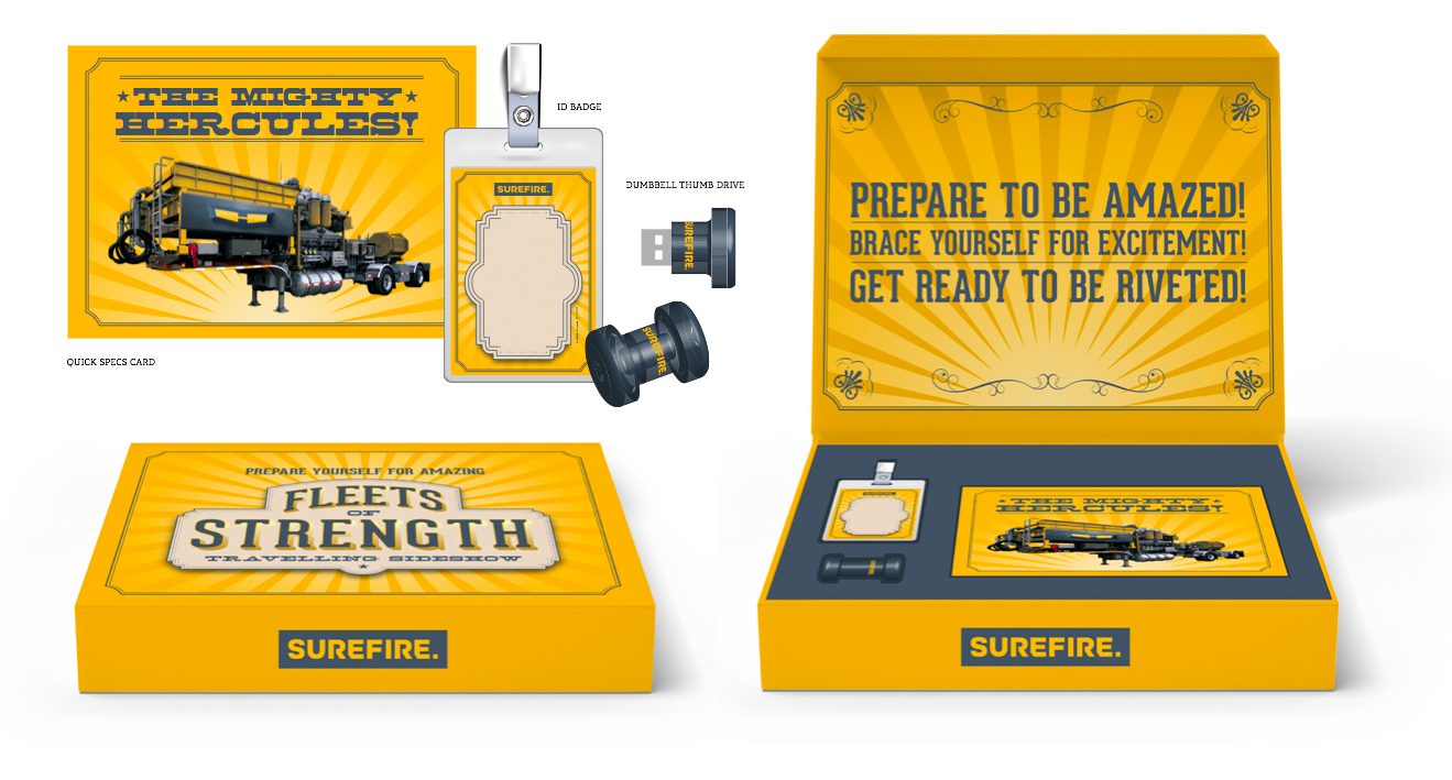 Surefire Industries is a manufacturer of top-quality stimulation and completion equipment. After this global player developed a new hydraulic fracturing unit that could dramatically strengthen equipment fleets, I was charged with the task of helping develop the product name, a rollout event theme, misc. event collateral pieces and a print ad.